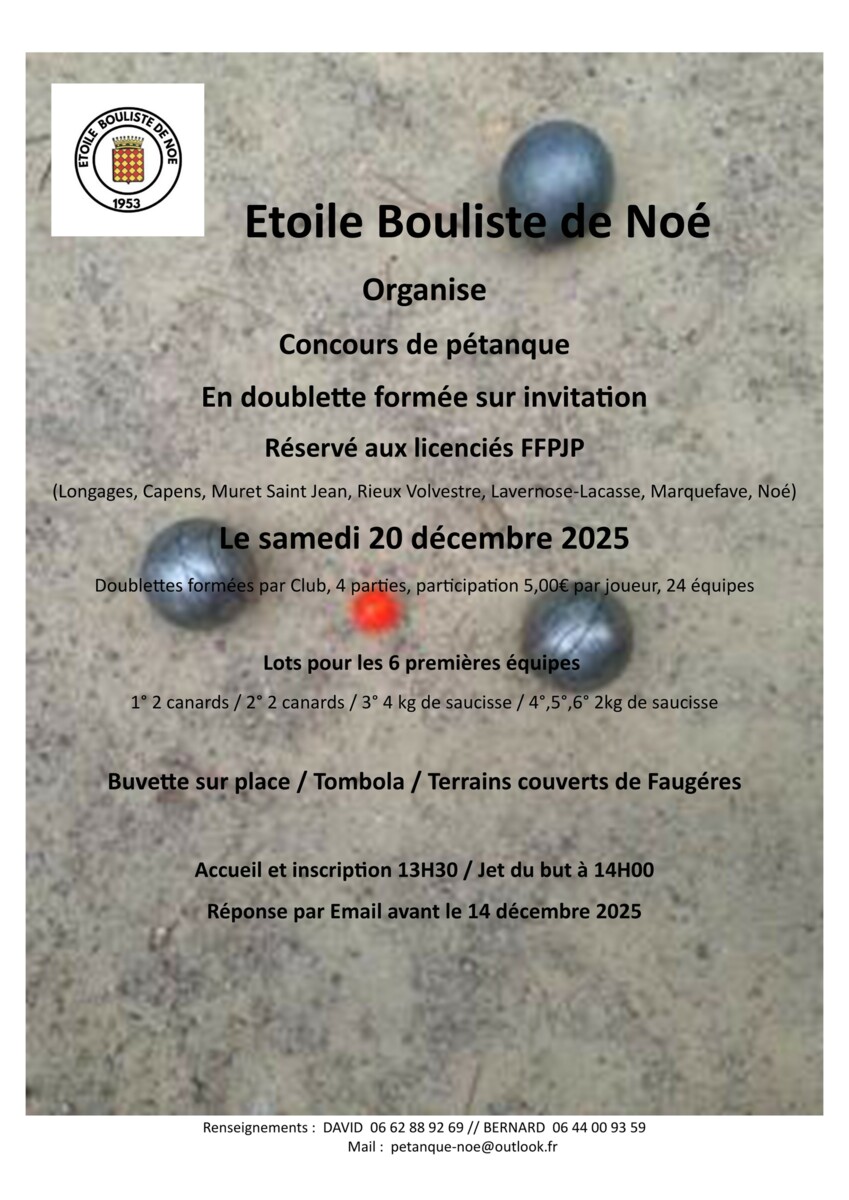 Petit rappel , ce samedi 20 Décembre , à partir de 13H30 venez encourager et soutenir les équipes lors du dernier concours de l'année . Buvette et tombola avec des bons d'achats Super U Noé à gagner.